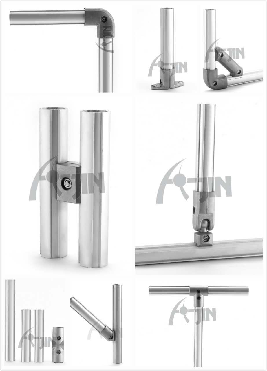以上產品分別有:精益管、90度直角連接件、 固定底座、角度斜支撐、平行緊固件、球形任意角件連接件、四通連接件、外45度角緊固件、三通連接件。