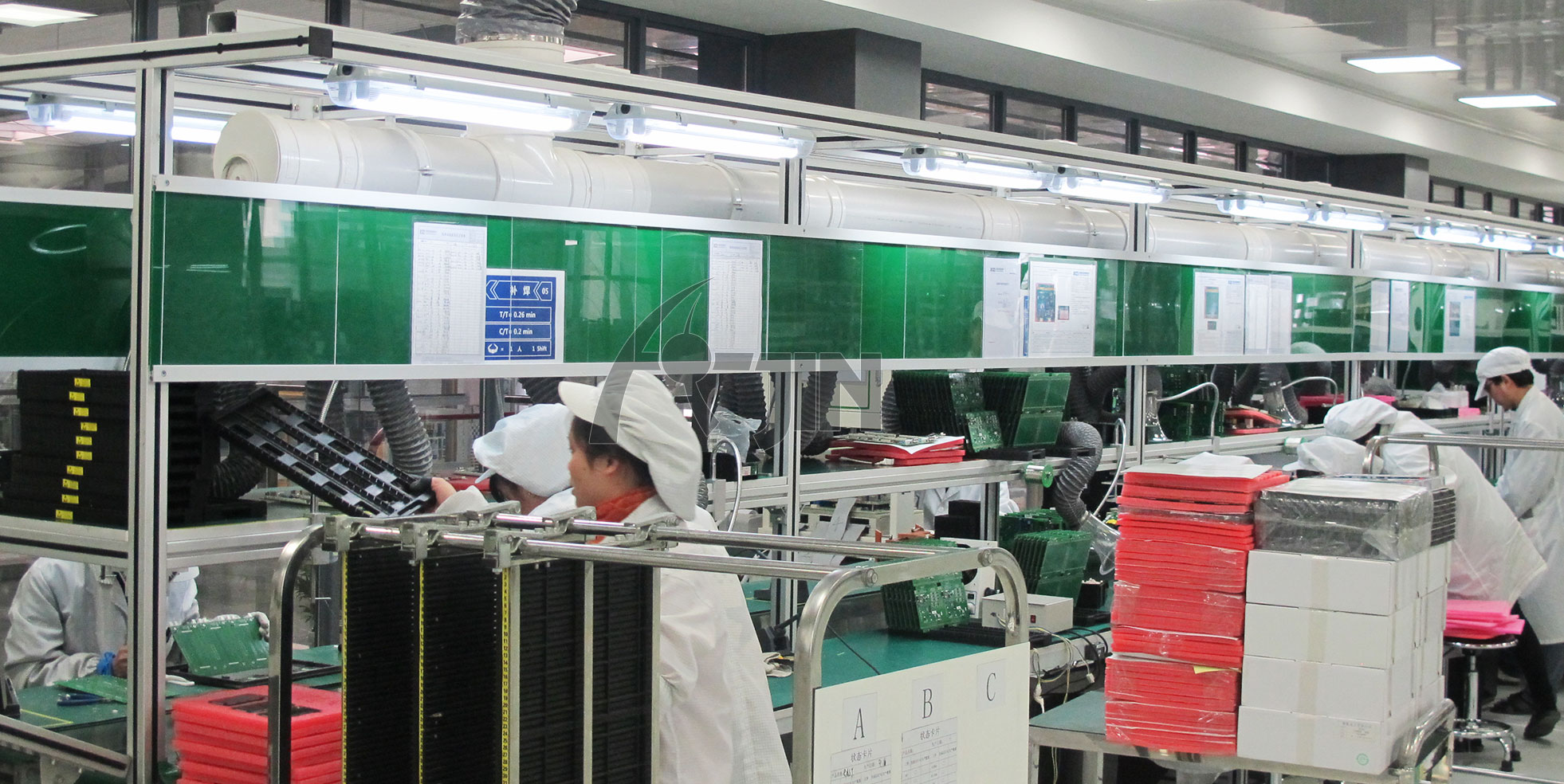 生產流水線是在一定的線路上連續輸送貨物搬運機械,又稱輸送線或者輸送機。按照輸送系列產品大體可以分為:皮帶流水線、板鏈線、倍數鏈線、插件線、網帶線、懸掛線及滾筒流水線這七類流水線。一般包括牽引件、承載構件、驅動裝置、張緊裝置、改向裝置和支承件等。流水線輸送能力大,運距長,還可在輸送過程中同時完成若干工藝操作,所以應用十分廣泛,使用我公司生產的各種生產流水線可以為客戶大幅節約人工、提升效率!